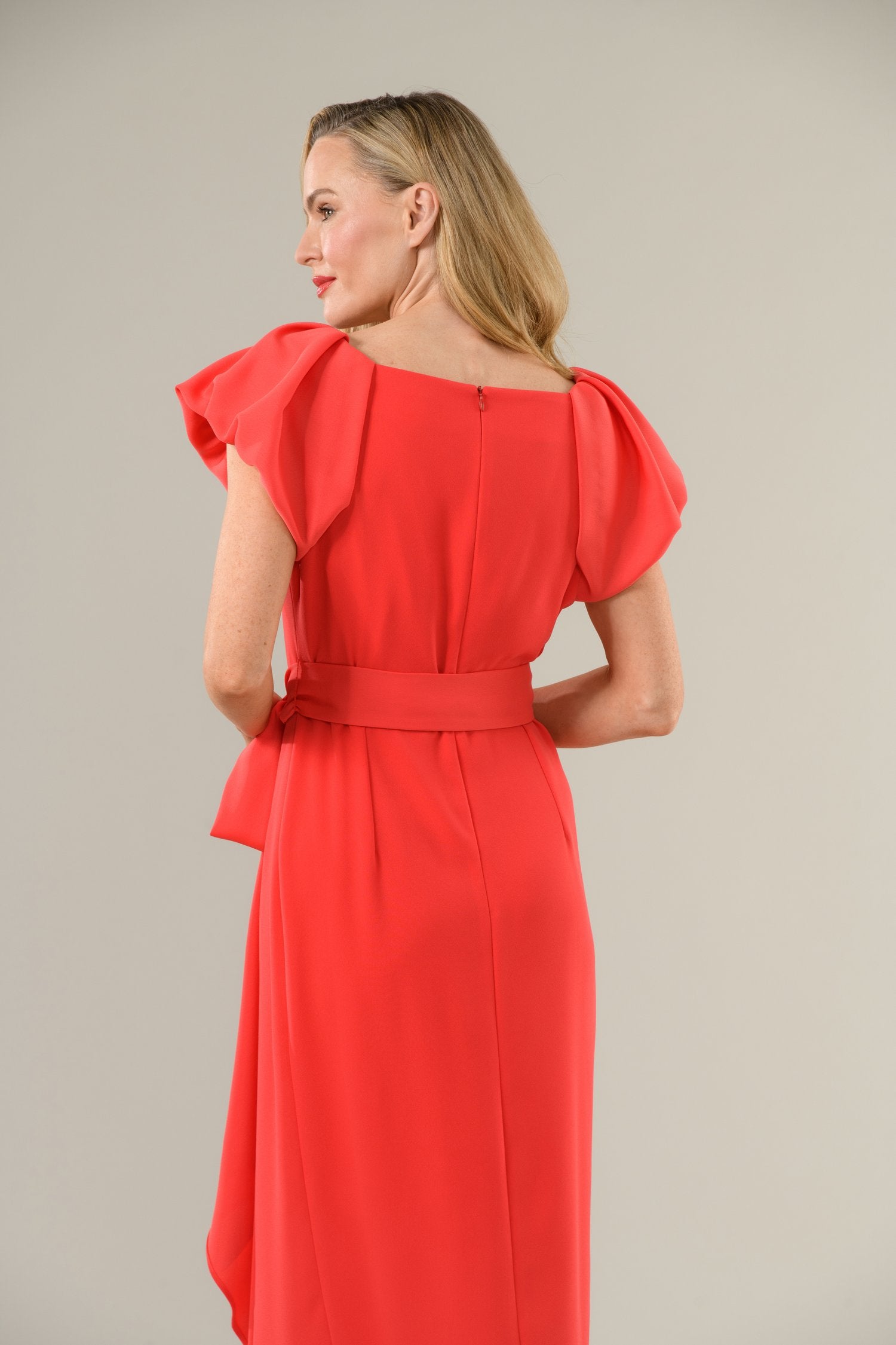 A showstopper in coral. The Della dress by Caroline Kilkenny cuts a sleek silhouette with softly structured puff sleeves, a wide bateau neckline and a flowing tie belt to accentuate the waist. Tailored yet fluid, it’s the kind of dress that turns heads at weddings, races and special dinners alike. A hidden zip closure and smooth lining ensure comfort from first toast to last dance.