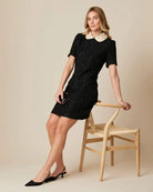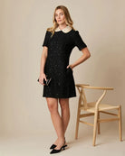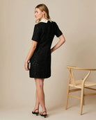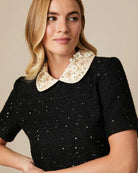 The Yvonne dress by Feeg is a short length black dress with a beautifully detailed cream hand beaded collar that is detachable, allowing this dress to be worn with or without the collar. The luxury tweed style fabric is woven with glittery sequins, has pockets and is fully lined.
