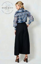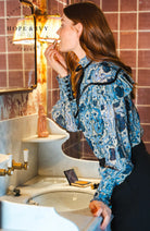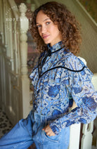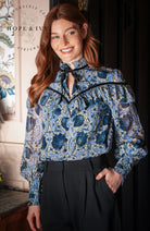 A celebration of print and texture, the Mylene blouse is adorned in a storied William Morris design and finished with tactile velvet trims. The high neckline flows into a soft tie, while gathered shoulders and frilled blouson sleeves lend effortless movement. A versatile wardrobe hero, it shifts seamlessly from relaxed daytime looks to refined evening pairings.