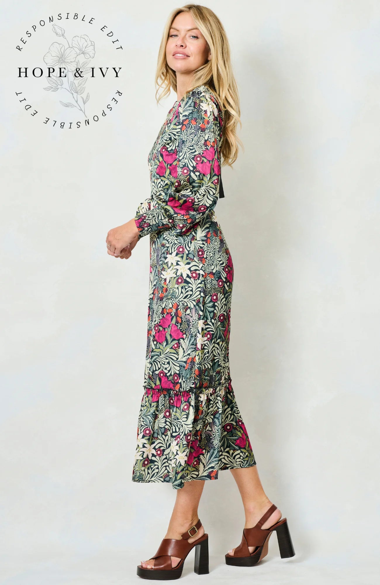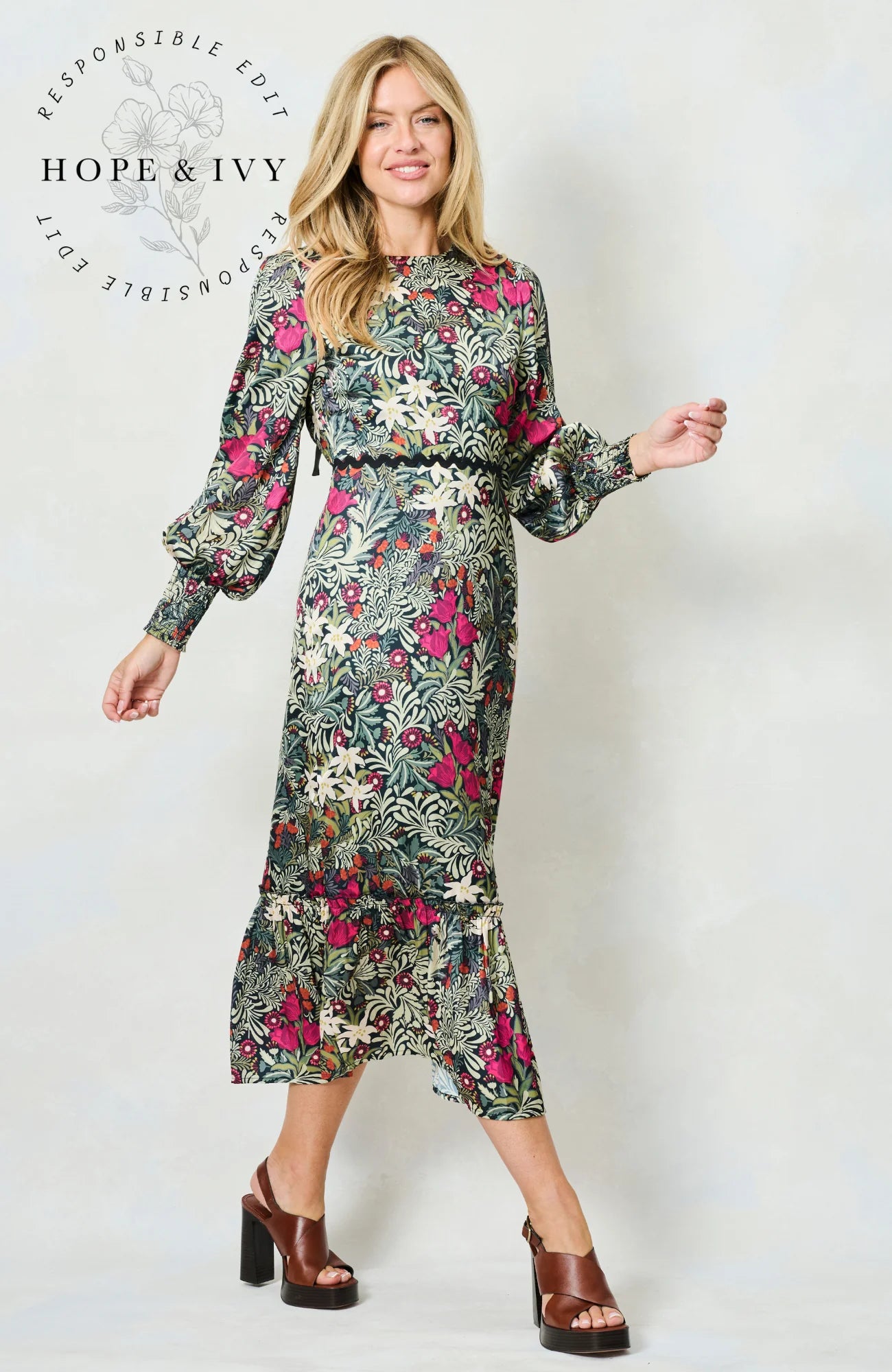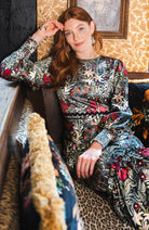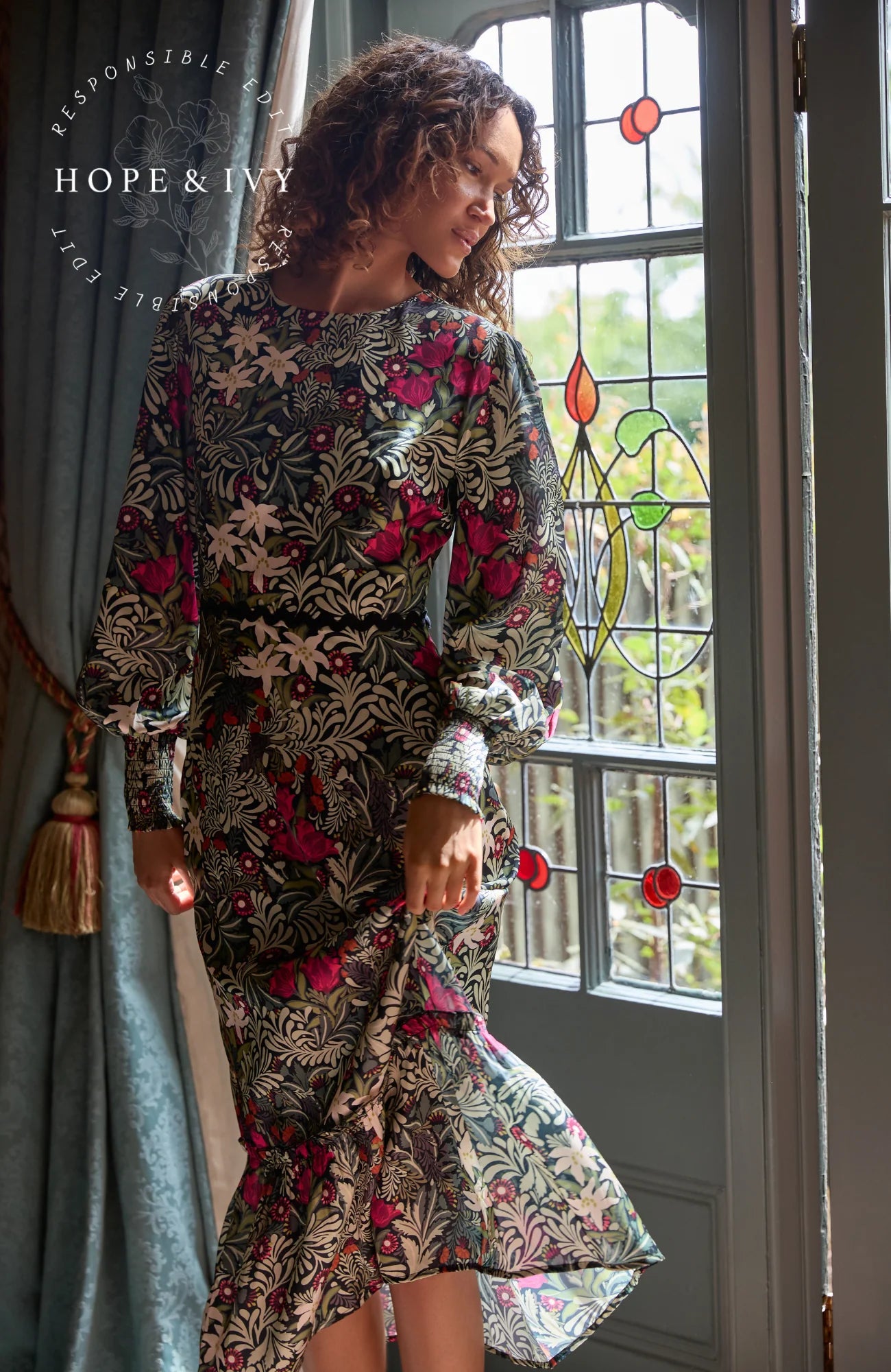 An ode to vintage romance, The Bramble showcases a William Morris print across fluid satin fabric , framed by soft velvet trims. The high neckline and gently blouson sleeves balance the elegance of a figure-skimming skirt, while an oversized bow ties the look together at the back. A timeless silhouette made for moments worth remembering.