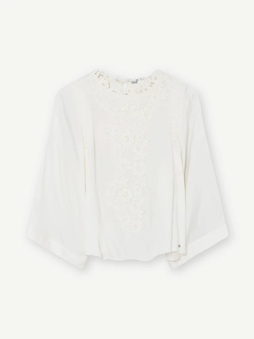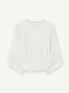 Gustav Judi A-Shape Lace Blouse is an off white lace blouse with intricate tonal detailing through the front and neckline. The lace overlay creates texture and depth, while the A-line silhouette allows it to fall cleanly away from the body. Wide sleeves enhance the relaxed shape and give the piece a modern balance against the romantic finish. It pairs beautifully with tailored trousers for occasions or with denim for elevated everyday wear.
