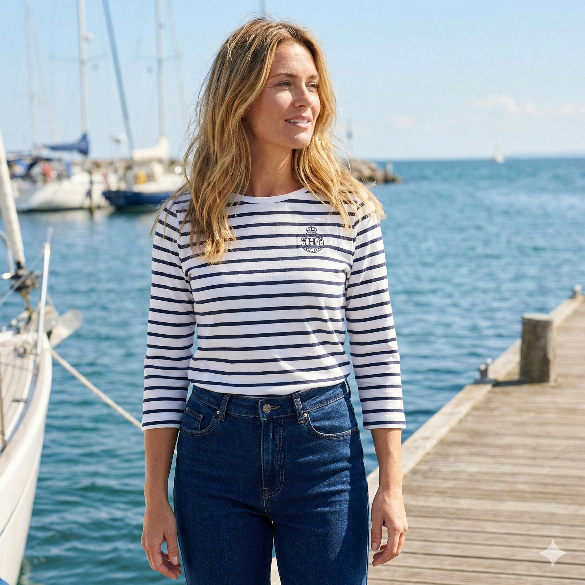 HV Society Caroline Navy & White Stripe Top is a classic Breton-style long-sleeve top with a relaxed, easy silhouette. Cut in a soft cotton jersey with clean navy stripes on a white base, it features a simple boat neckline and a small embroidered crest at the chest. An everyday piece that works just as well layered under knitwear as it does worn on its own with denim or tailored trousers.