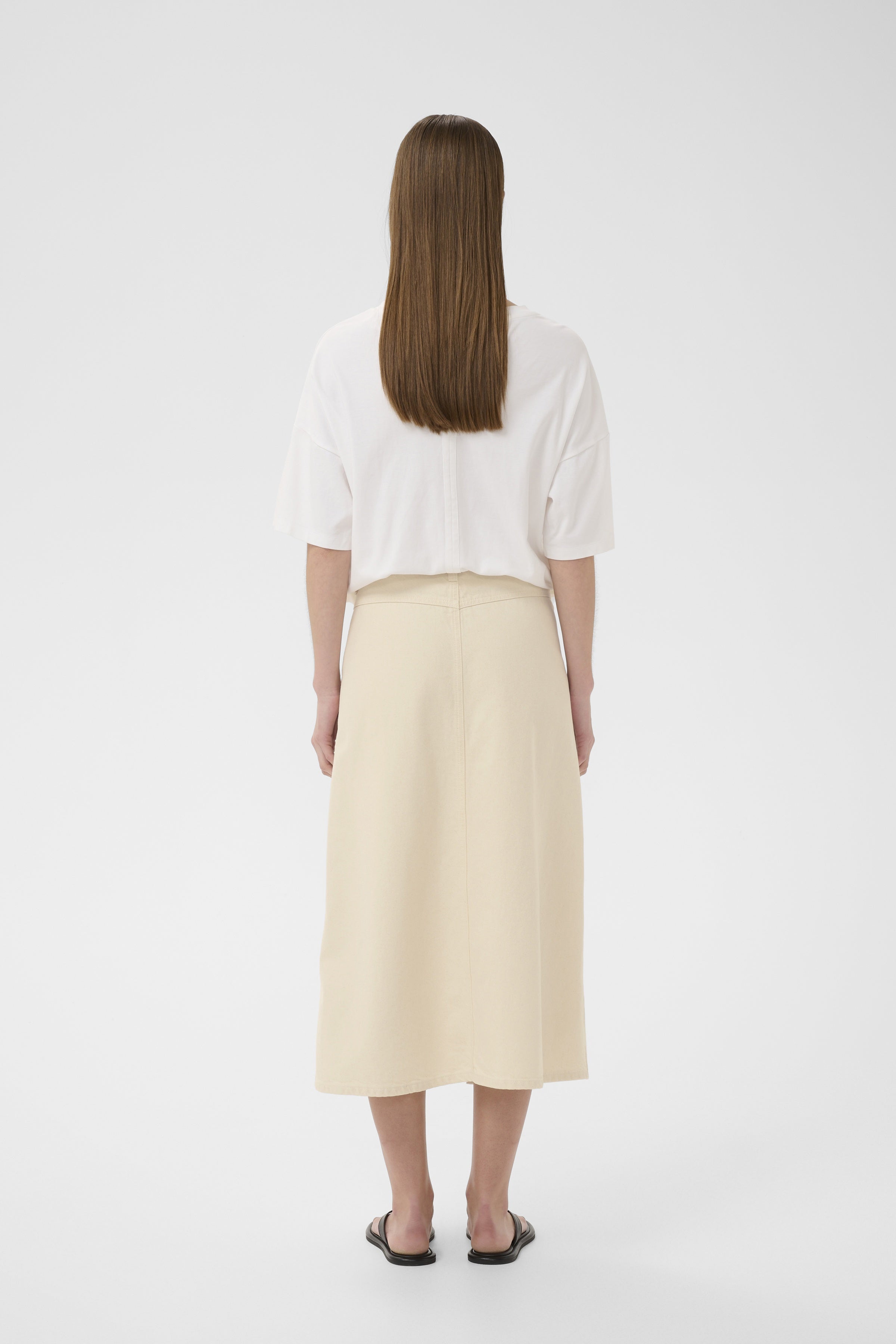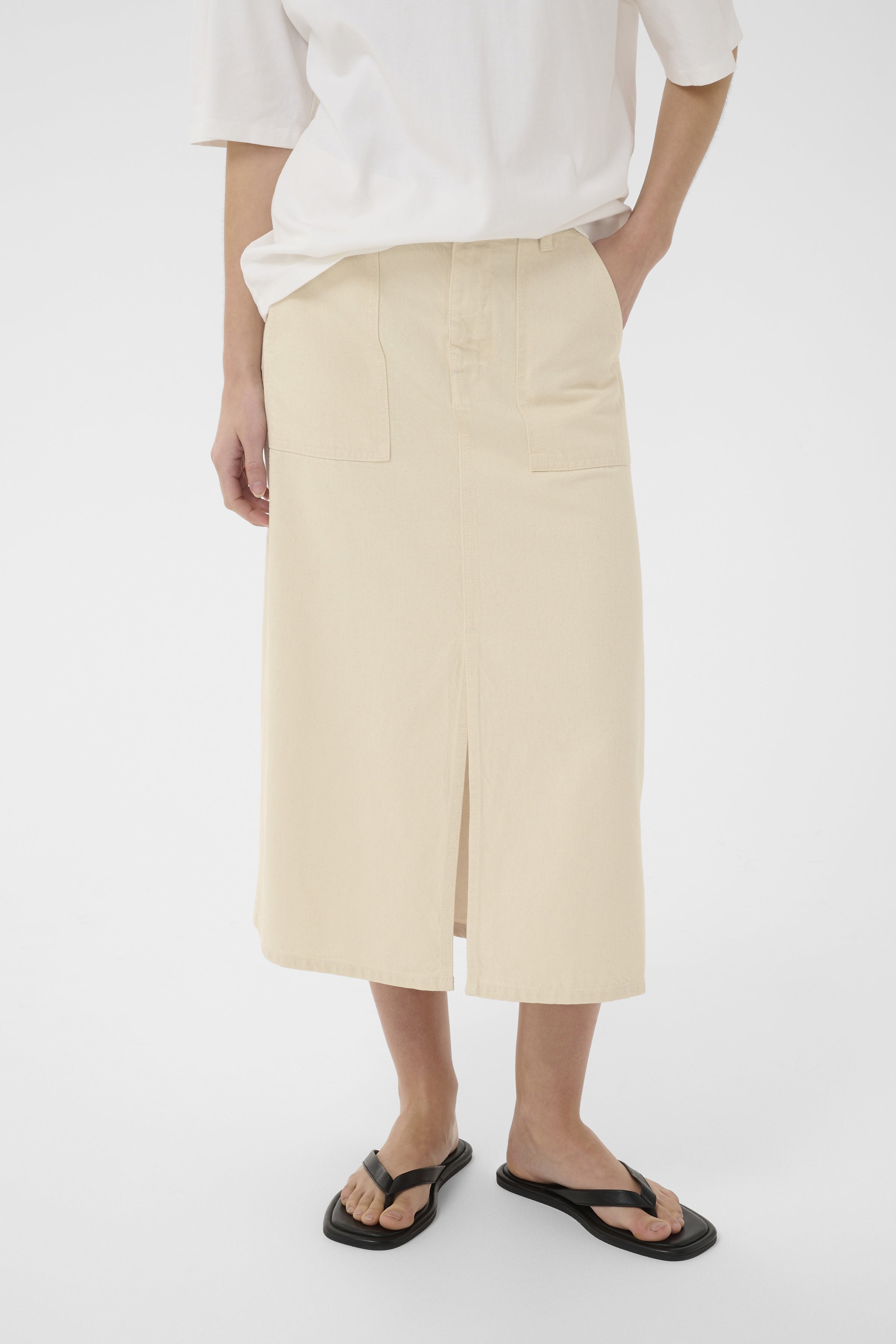 The InWear Button Front Denim Midi Skirt is cut in a structured yet soft denim with a clean, straight silhouette that falls below the knee. A full button front adds subtle detail, while patch pockets and a front slit bring ease and movement to the shape. Designed with a regular waist and belt loops for styling versatility, it is a modern midi skirt that works effortlessly with simple tees, crisp shirts or fine knits.