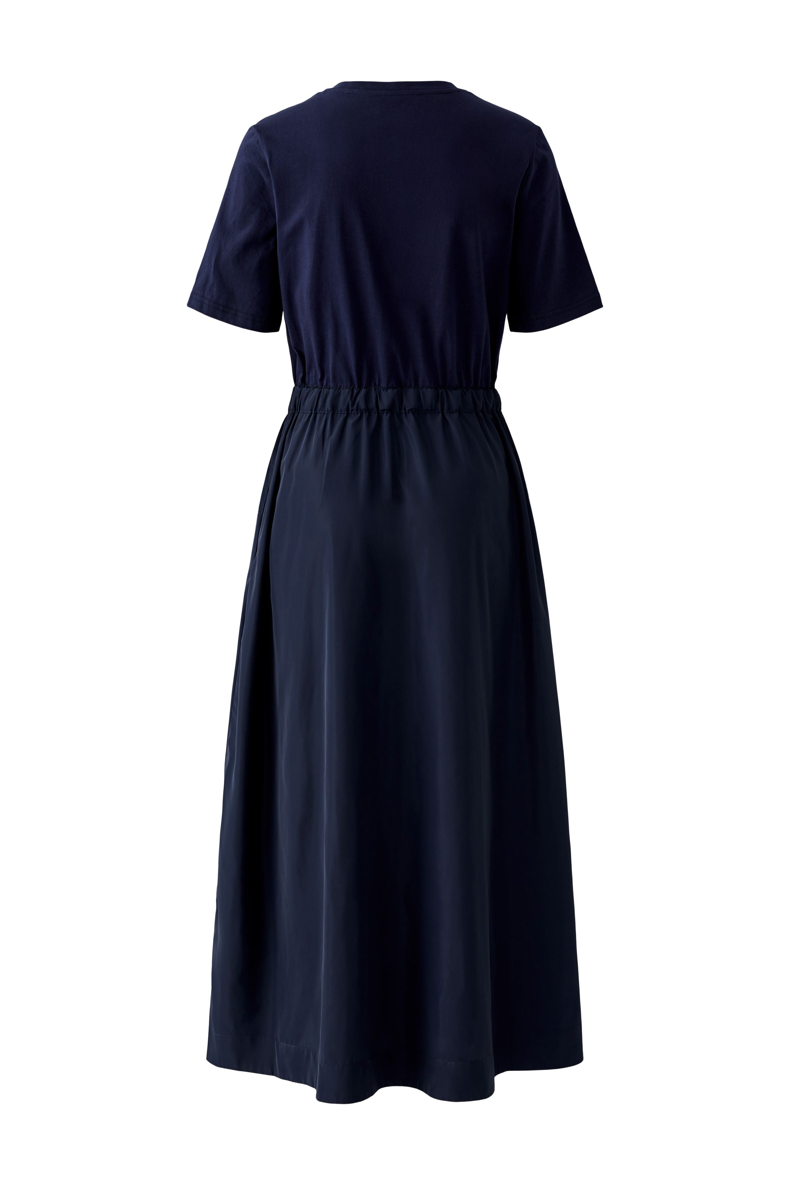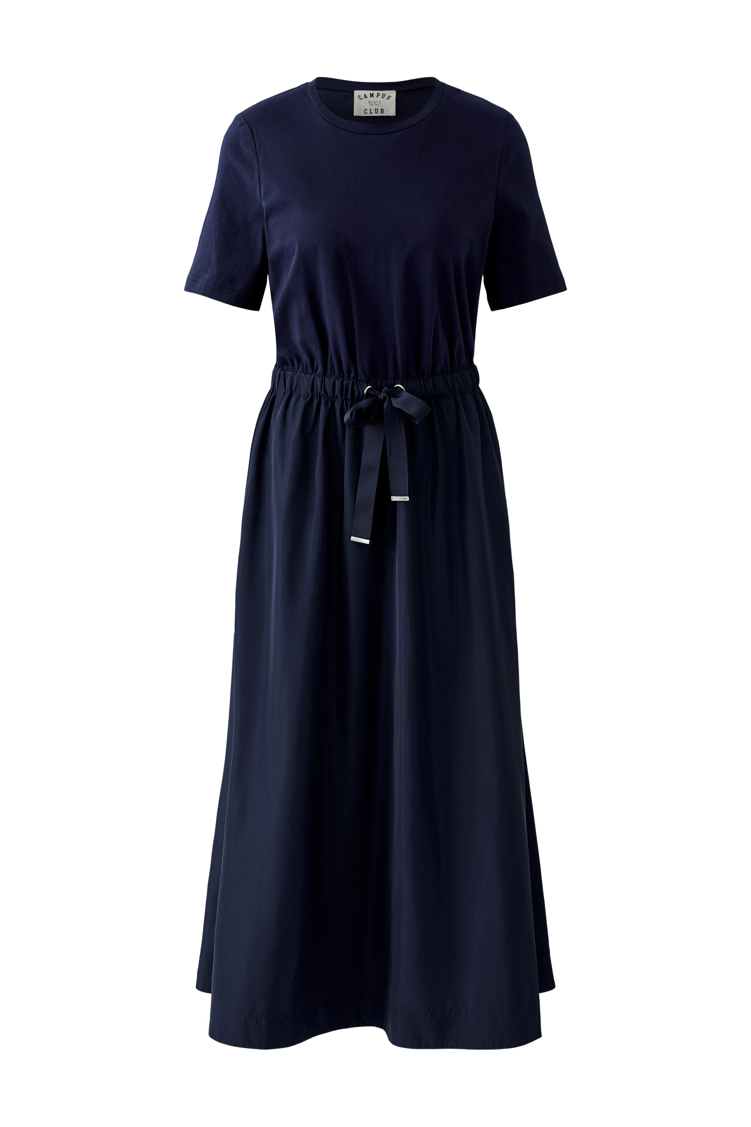 The Oui Short Sleeve Maxi Patch Dress pairs a soft cotton jersey top with a structured taffeta-look skirt, creating a subtle contrast that feels modern and easy to wear. Cut in a fitted silhouette that falls to full maxi length, it is shaped with an elasticated waistband and drawstring tie for a flattering, adjustable fit. Side pockets add everyday practicality, while the clean crew neckline keeps the finish refined and unfussy. A strong, versatile navy maxi dress that works just as well with trainers as it does with a simple sandal.