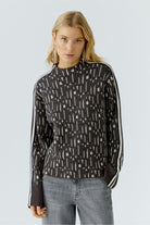 A modern take on the classic knitted jumper from Oui, woven in a soft viscose-blend jacquard with graphic letter detailing. The casual, slightly cropped cut sits neatly on the hip, while raglan sleeves and contrast side stripes add a subtle sporty feel. Finished with a short collar and clean cuffs, it’s the piece that works as easily with wide-leg jeans as it does with tailored trousers.