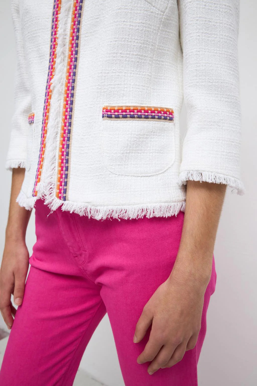 Bariloche Acebo Short Tweed Style Jacket is a fresh take on a classic tweed boucle. This lovely jacket is cut in a neat straight shape that sits clean through the body. The ivory weave is finished with raw fringe at the neckline, cuffs and hem, while the multicoloured ribbon trim adds a sharp line of colour through the front and pockets.