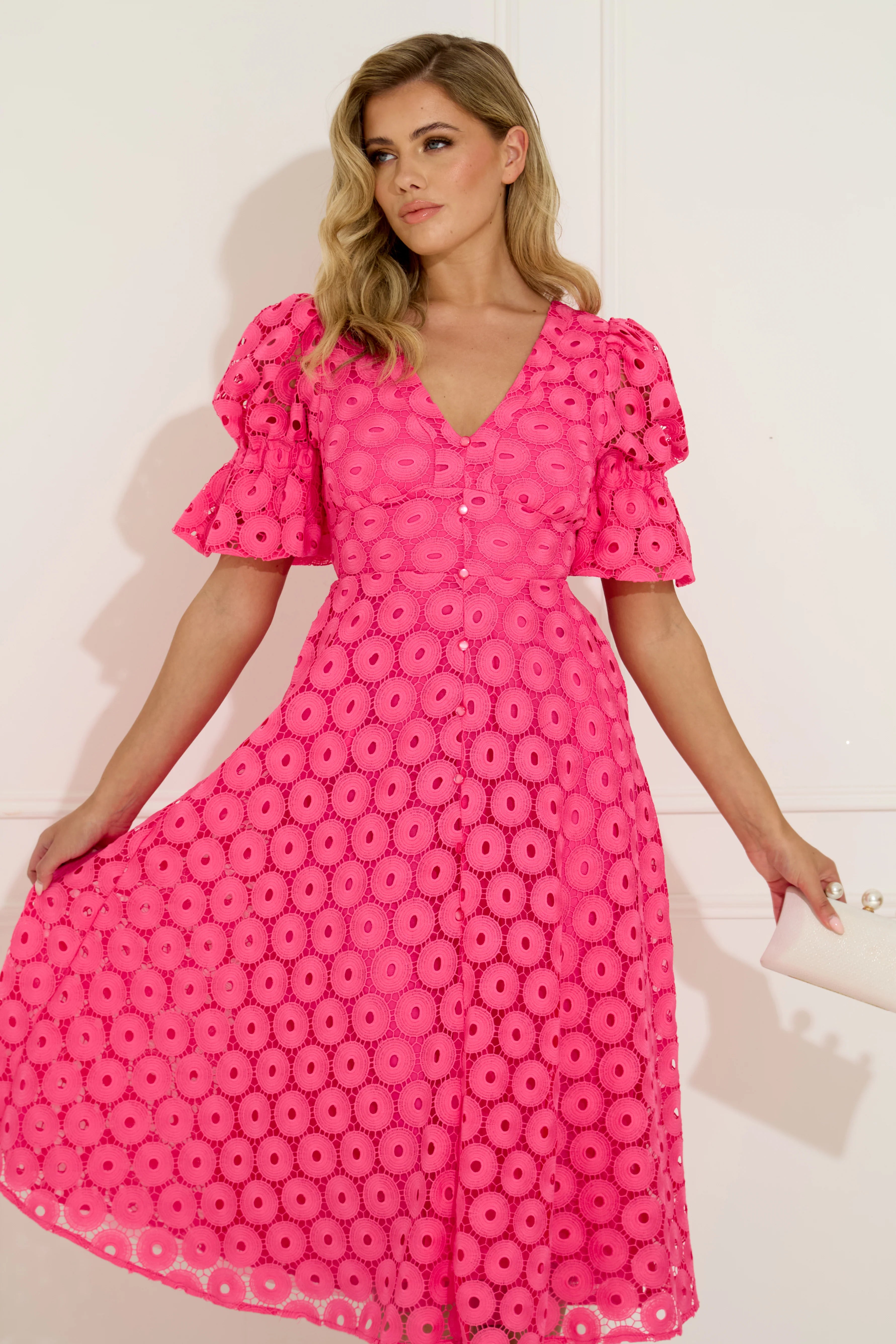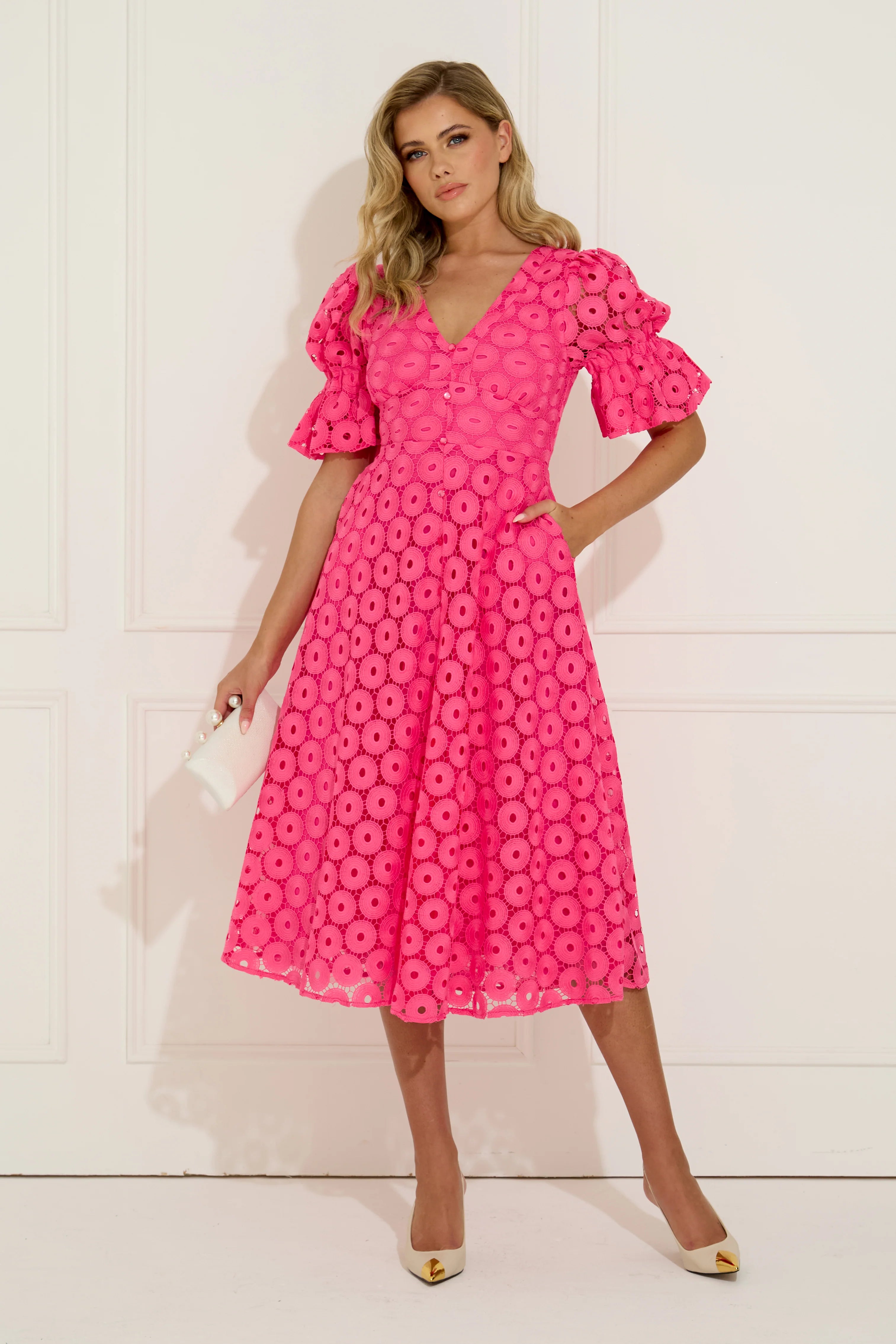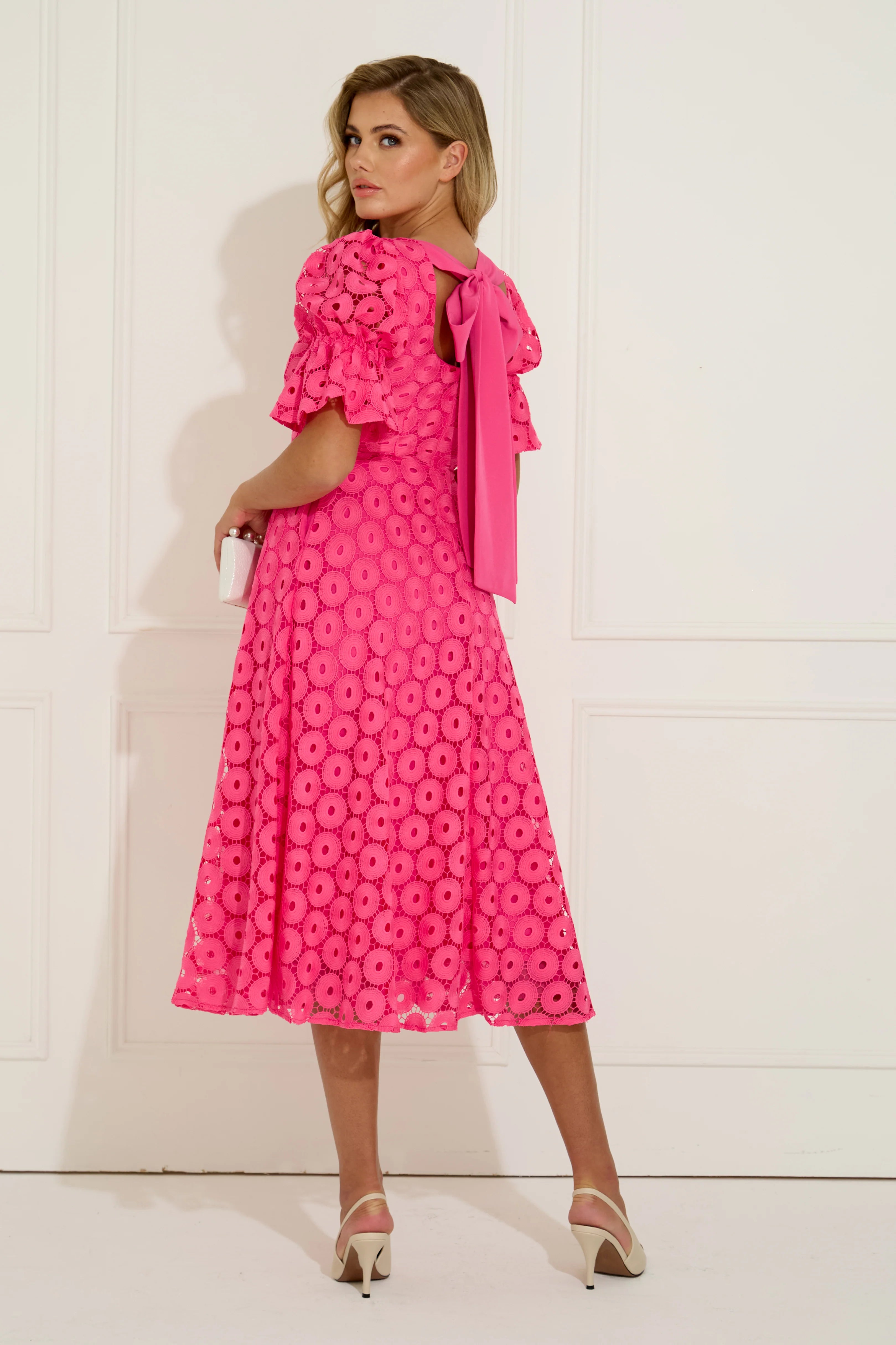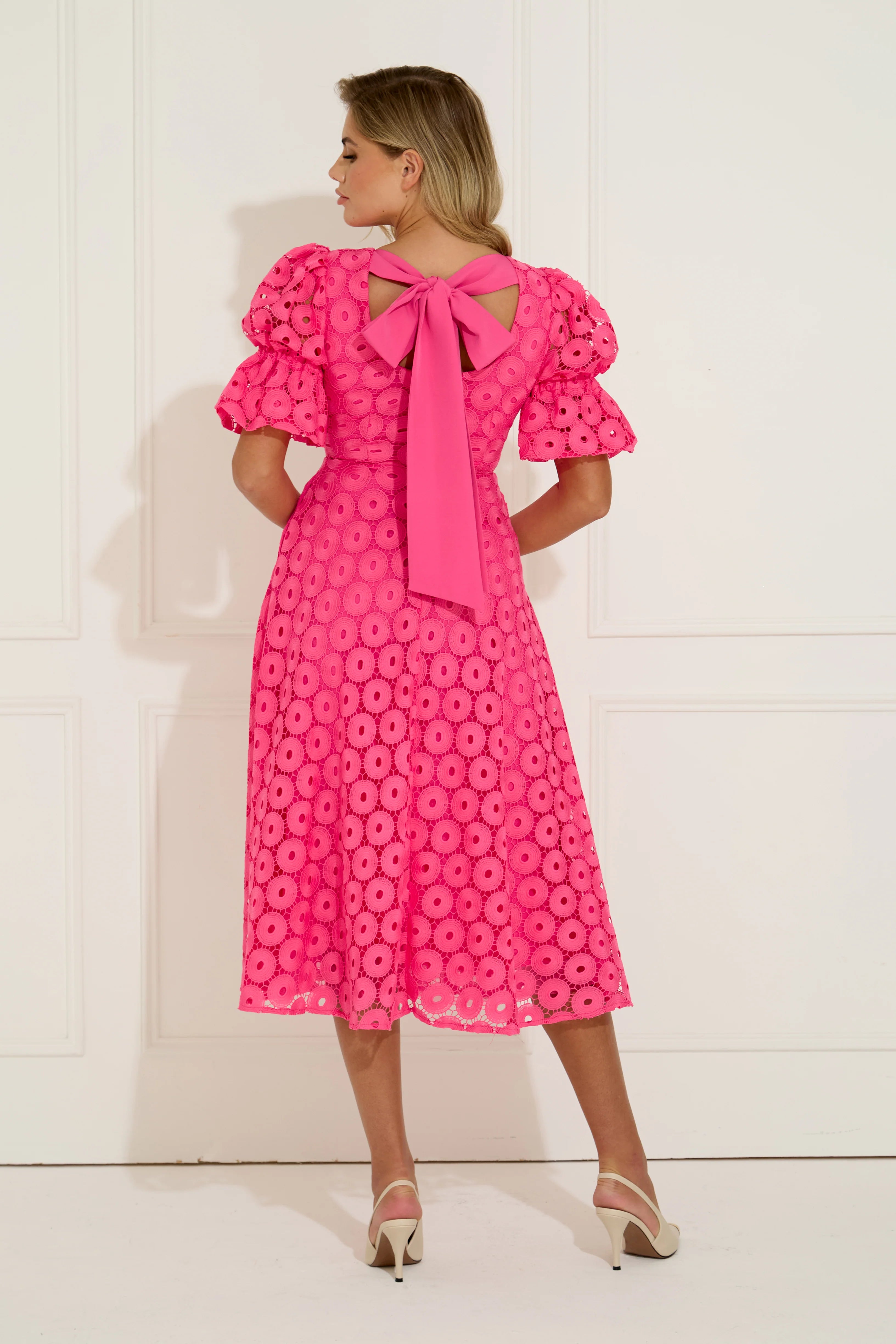 The Callie midi dress returns in bright fuschia pink with an elegant bow-back detail that elevates this bestselling dress. Crafted in embroidered lace with gentle stretch, it features a flattering V neckline, softly structured puff sleeves and a fluid full skirt that moves beautifully, finished with discreet side pockets and full lining for comfort. Designed to sit high enough at the back to wear a bra, this is an effortless occasion dress for weddings, Ladies Day and summer events where stype and comfort matter equally.