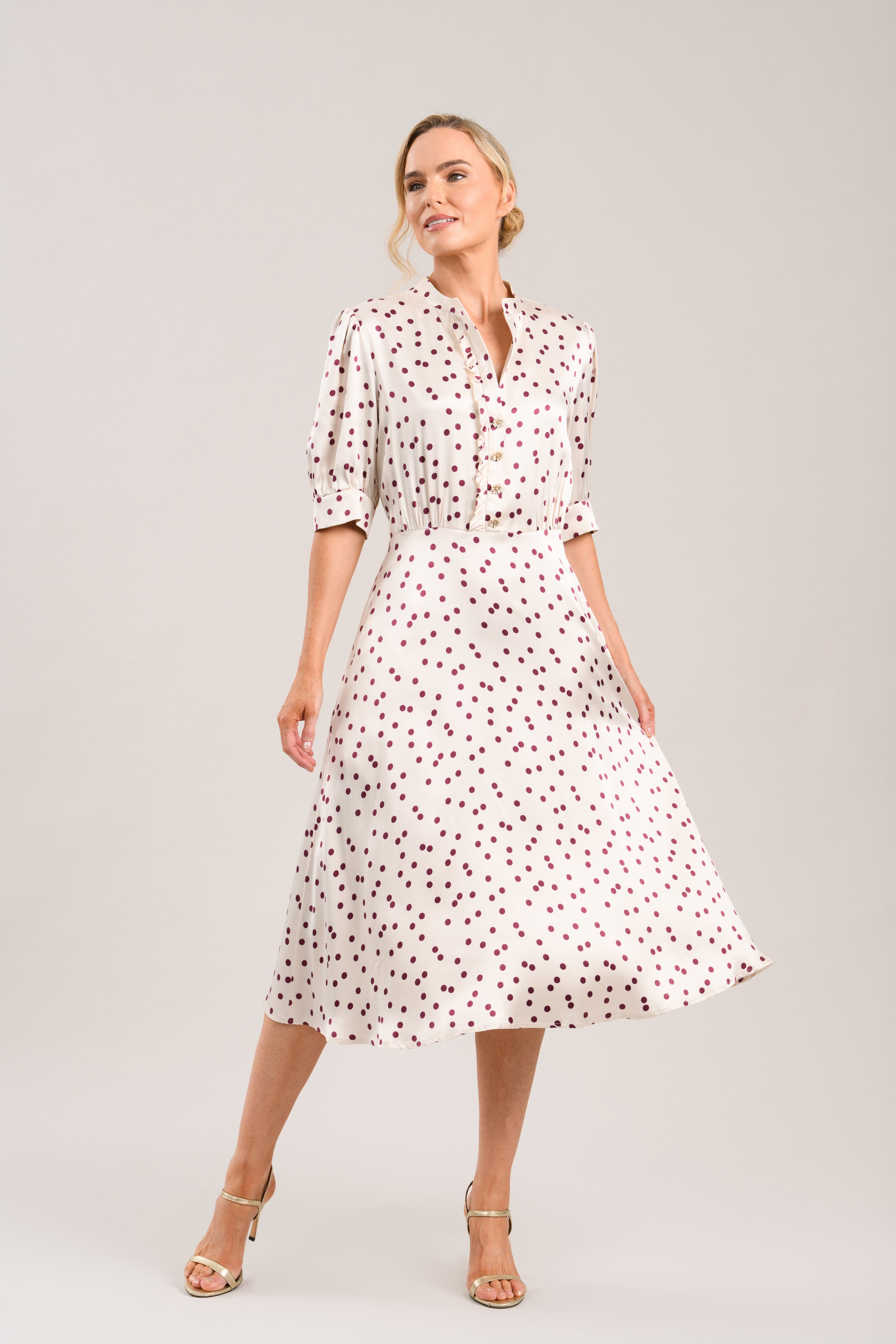 Caroline Kilkenny Dove Polka Dot Occasion Dress is a refined cream midi dress with an all-over berry polka dot print. The softly structured bodice features delicate ruffle detailing and covered buttons, balanced by elbow-length sleeves and a gently flared skirt. The defined waist creates shape while maintaining ease through the silhouette. A eleganr choice for wedding guests, race days and special summer events.