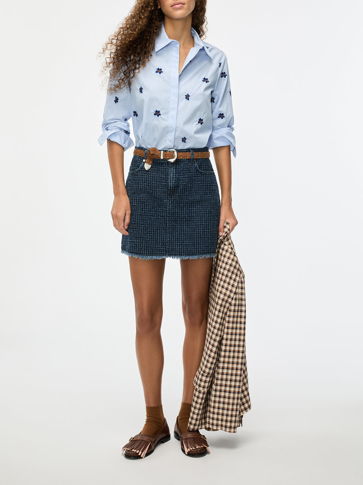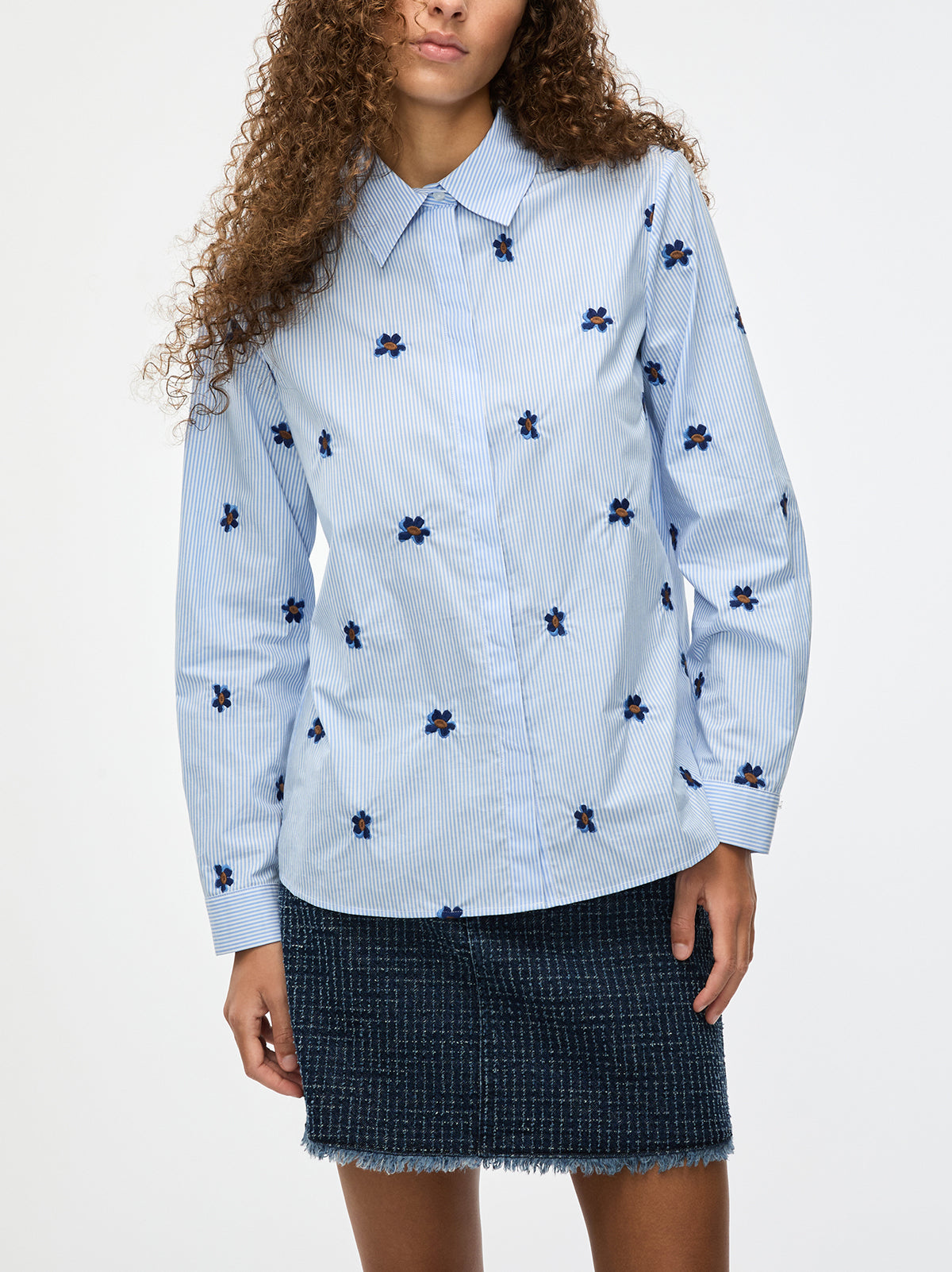 The Iblues Broncio Pinstripe Shirt is a modern update on a classic tailored silhouette. Cut in crisp blue and white pinstripe cotton with delicate embroidered florals scattered throughout, it balances structure with subtle detail. The straight fit, classic collar and concealed button fastening keep it sharp yet easy to wear. A polished everyday shirt that works with denim, tailoring or textured skirts.